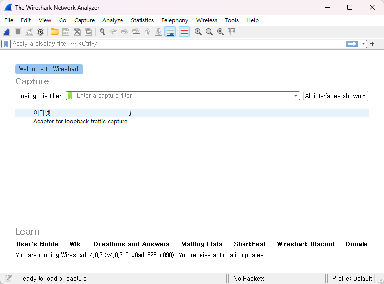 와이어샤크를 실행시키면 해당 화면이 나옵니다.