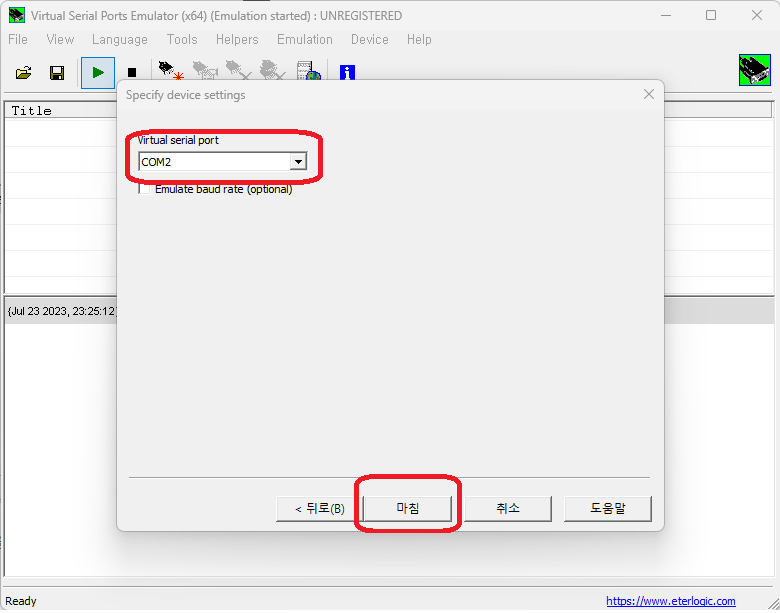 5. 가상 시리얼 포트를 몇번으로 할지 선택 후 마침을 클릭합니다.