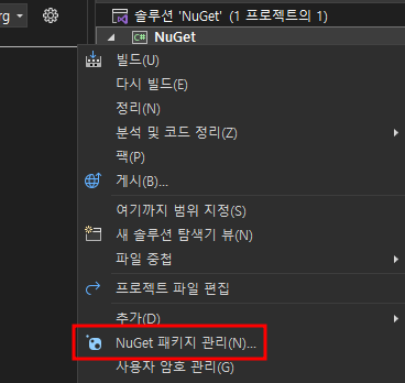 [Visual Studio] NuGet 다운로드 - Visual Studio NuGet 다운로드 방법을 알아보겠습니다. 1. Visual Studio 2022 (버전은 상관없습니다.) 실행시킵니다. 2. 프로젝트 우클릭 - NuGet 패키지 관리 클릭합니다. 3. 원하는 NuGet을 찾아보기에서 검색하면 끝납니다. - 찾아보기 : NuGet을 검색합니다 - 설치됨 : 설치되어있 NuGet을 확인합니다. - 업데이트 : 설치된 NuGet의 업데이트를 확인 및 업데이트 합니다. 기타 2023.07.24